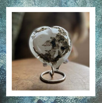 Het bovenstaande Hart heeft een holle binnenruimte waarin u zelf een kleine hoeveelheid as kunt doen. Aan de onderzijde/achterzijde zit een opening die, eenmaal gevuld, afgesloten wordt met een zelfhechtend sluitplaatje.